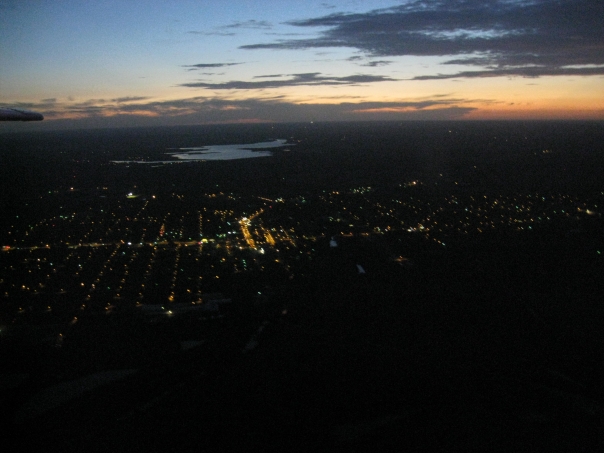 Sunset over a metropolitan area with a beautiful lake in the background.