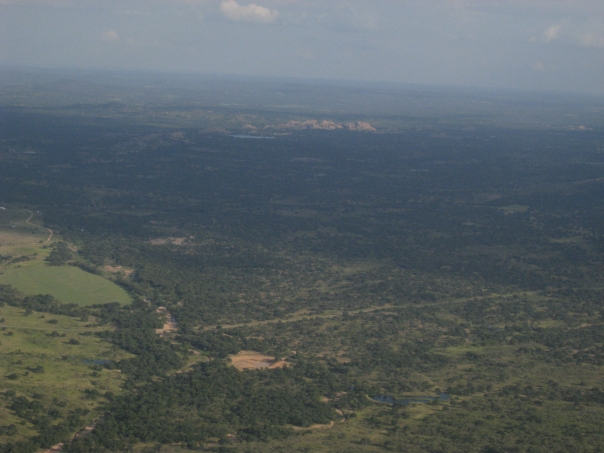An aerial shot of a wooded landscape with meadows and small lakes visible in places.