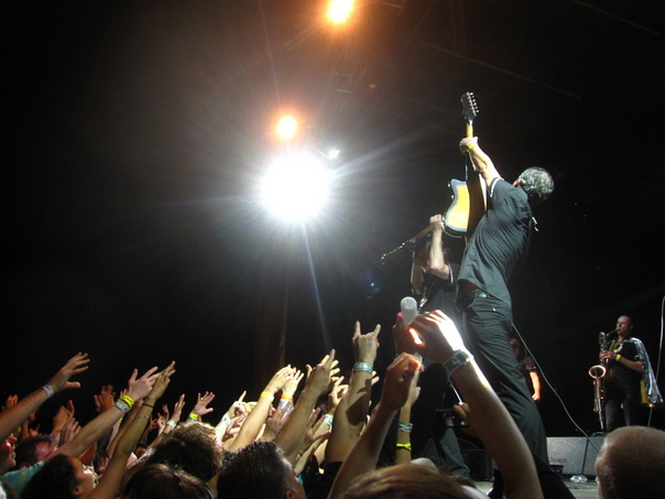 A musician on stage is holding his guitar in the air while an enthusiastic crowd reaches it to him. |