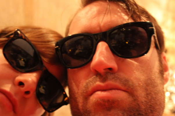 This picture appears to be to people with sunglasses on looking at the camera. |