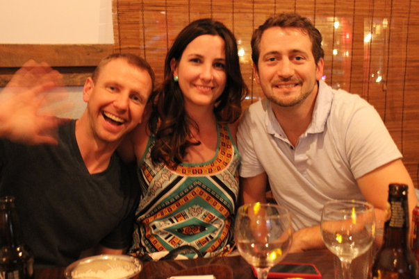 An enthusiastic man waves at the camera with his wine-swilling friends |