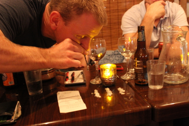 Friends are gathered to have fun and drink and eat food |