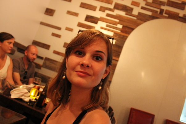 This woman is smiling at the camera while sitting at a table in a restaurant. |