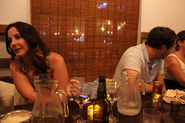 People sitting next to each other at a table lean in opposite directions to talk to others. |