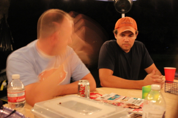 A partially blurred shot shows a man in gray t-shirt talking with another man wearing an orange cap and black t-shirt while both sit at a table with soft drinks and water.