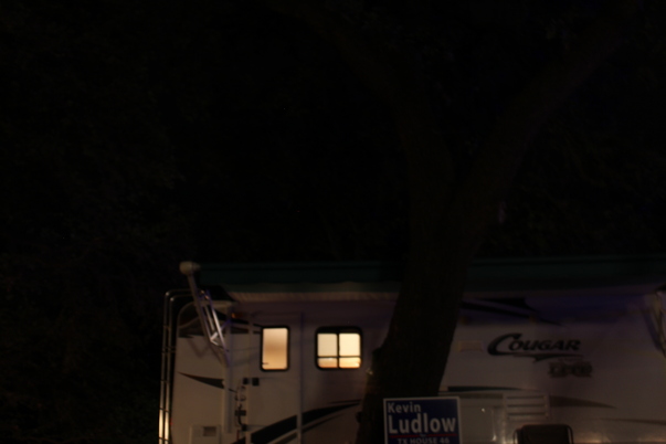 The camper is still very lit up, indicating that everyone is still awake and there is a canopy still out over the rv.