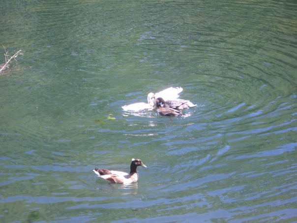 THERE ARE TWO BROWN DUCKS AND TWO WHITE DUCKS FIGHTING FOR FOOD WHILE ONE BROWN DUCK SWIMS CALMLY BY.