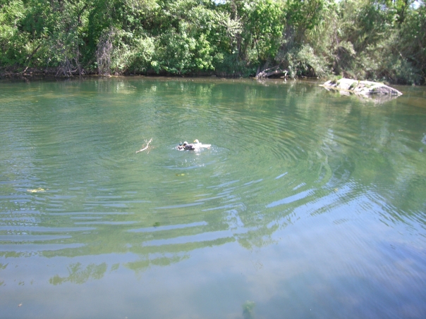 ducks swimming in the middle,of a big green lake,surrounded by green plants.