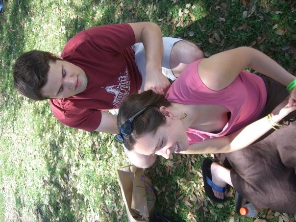 Two young College age people sitting in a partly shaded grassy area of a field.