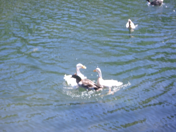 Three white docks and two mallard ducks are playing or fighting while swimming.