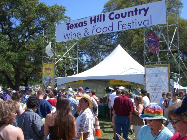 A white sign on scaffolding proclaims in blue letters, "Texas Hill Country Wine & Food Festival", over a white tent and a crowd of people.