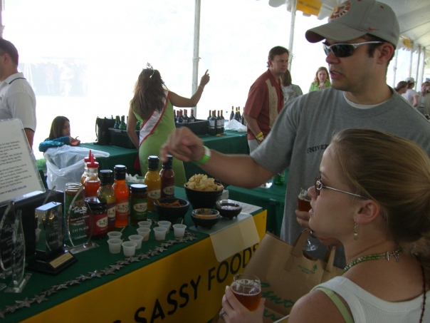 There is a man wearing sunglasses and a hat and a woman wearing a white tank top standing in front of a food sample booth.