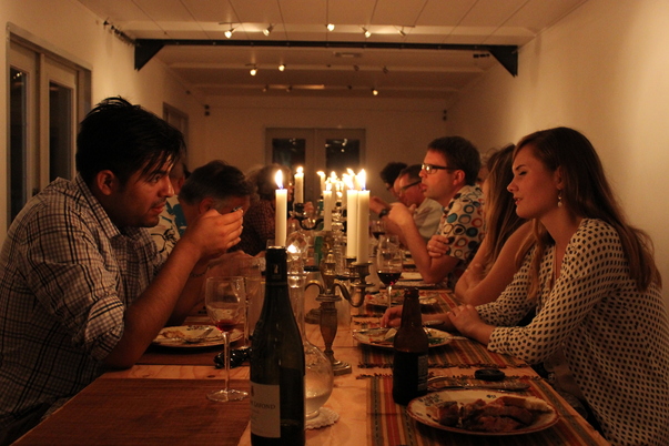 I see a large group of people sitting at a long table with lit candles having dinner.