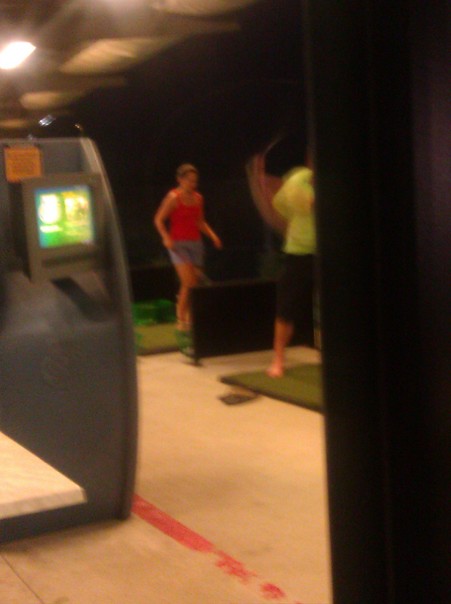 This dark golf practice area has a nice ambiance for couples. |