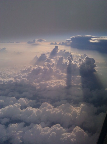 Sunrays make shadows on fluffy white clouds that are seen below an aircraft window. |