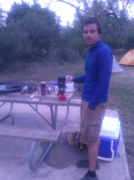 A man in a blue turtleneck and khaki shorts stands next to a picnic table and a blue and white cooler. |