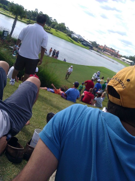 Several people sitting down on green grass watch other people play golf. |