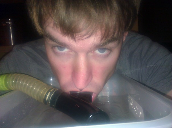 This man is practicing his SCUBA technique at home with a pan of water. |
