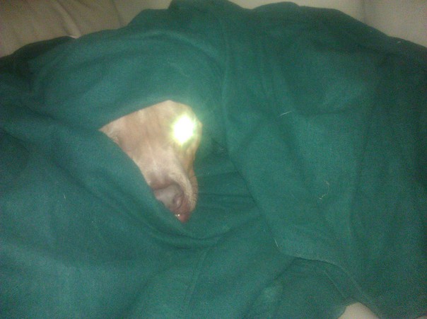 A dog is hiding in a blanket peering out and his eye caught the camera flash. |