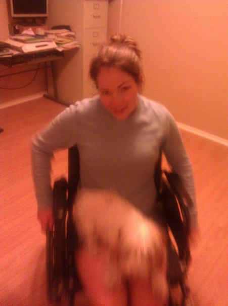The young lady in this picture is sitting with her dog and the picture is blurry. |