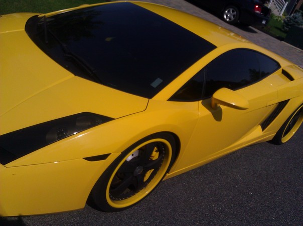 An immaculate bright yellow sports car with matching yellow rims is on display. |