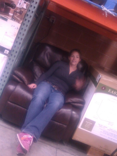 The young woman is sitting on a brown leather chair as she looks forward at the store's merchandise. |