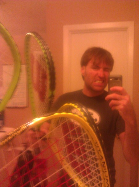 A man is taking a photo of himself in the mirror, holding tennis rackets in one hand and his phone in the other. |