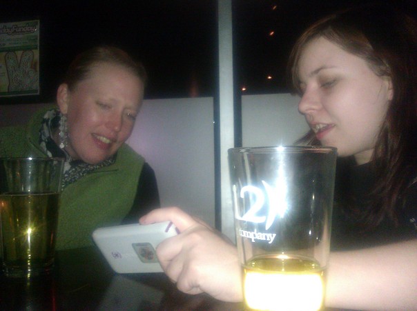 Two women enjoying beer at a restaurant looking at their white phone. |