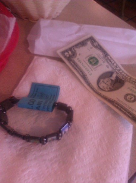 A bracelet purchased during a sale is left on the table along with a 2 dollar currency note. |