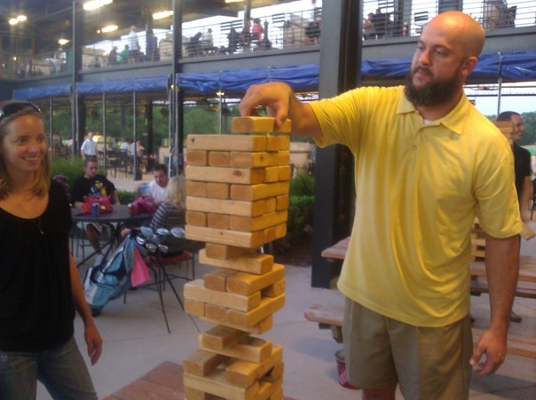 A man with a beard in a yellow shirt playing a large version on jenga with a woman. |