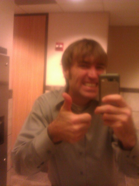 Young man in grey dress shirt taking a photo of himself giving thumbs up. |