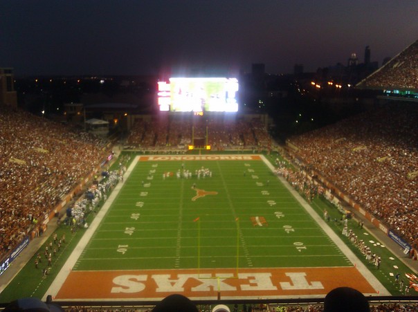There is a high above view of the college football stadium where the University of Texas plays. |