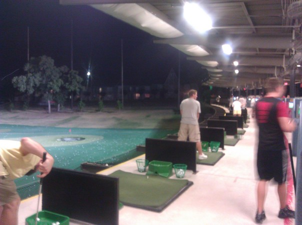 The people in this picture look like they are at a golf range having fun. |