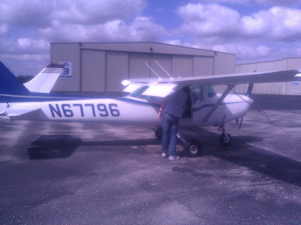 A man on a tarmac leaning into the cockpit of an N67796 airplane. |
