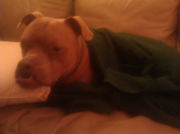 A scary-looking dog is wrapped inside a blanket and laying down on a couch, his head resting on a pillow. |