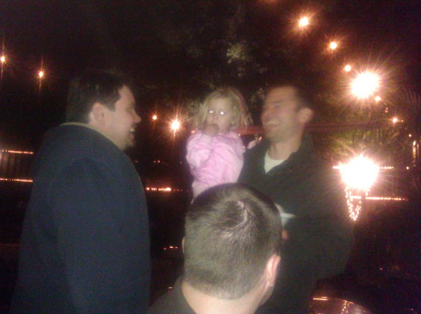A father is holding his child laughing with two other guys in an outdoor eating place. |