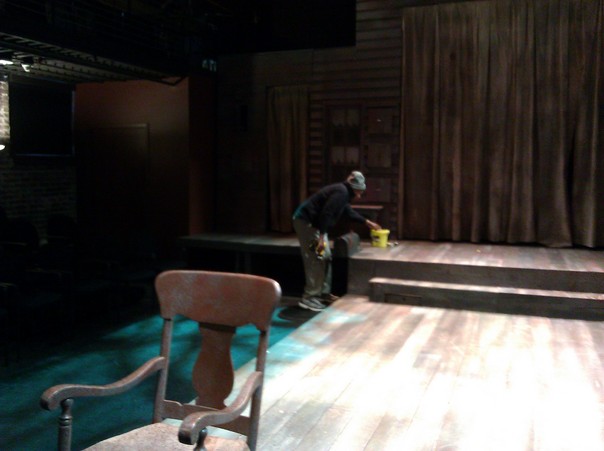 An empty wooden chair sits in a room while a single person in the background reaches into a yellow bucket. |