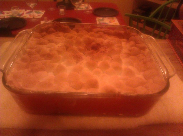 Pieces of meatball-sized food are in a casserole dish, with a set table in the background. |