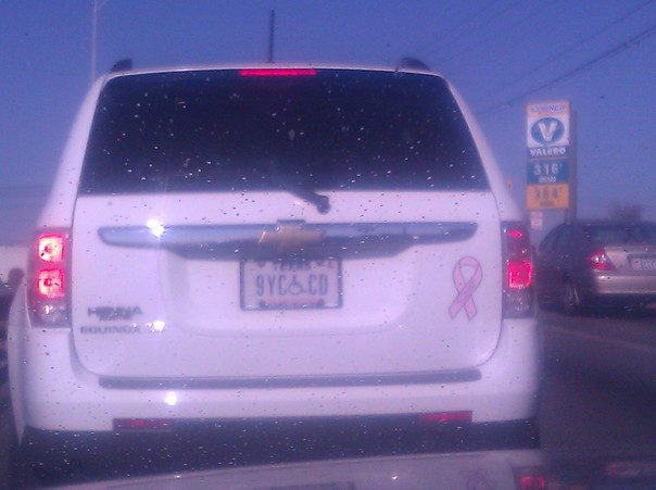 A white equinox with a handicapped license plate and a breast cancer ribbon on the back. |