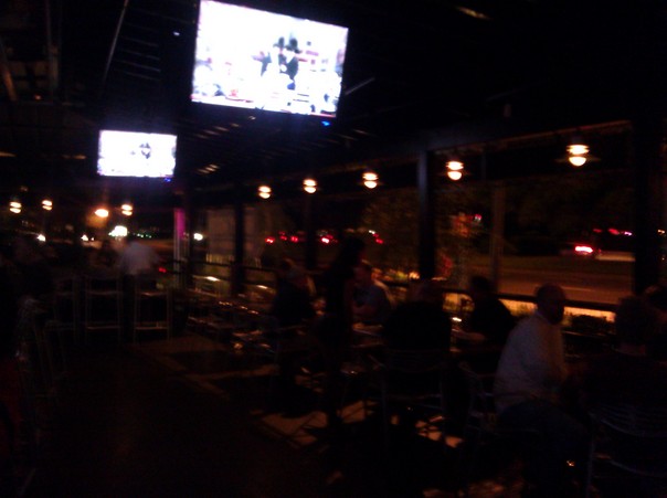 a dark picture of people sitting, and two large LCD tv's above them |