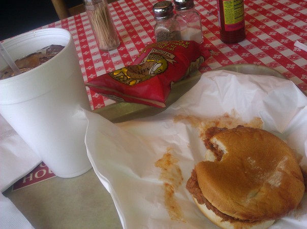 The fast food food meal contains a drink in a white foam cup and partial eaten sandwich upon a napkin. |
