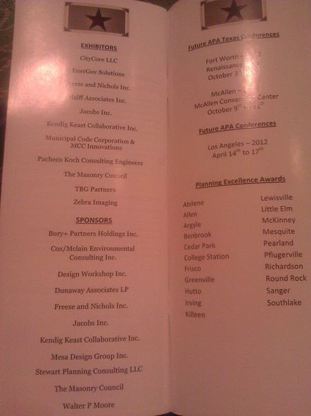 the program above gives a list of current exhibitors as well as a list of future APA conferences, and APA Texas-specific conferences. A list of cities qualifying for Excellence awards is included.