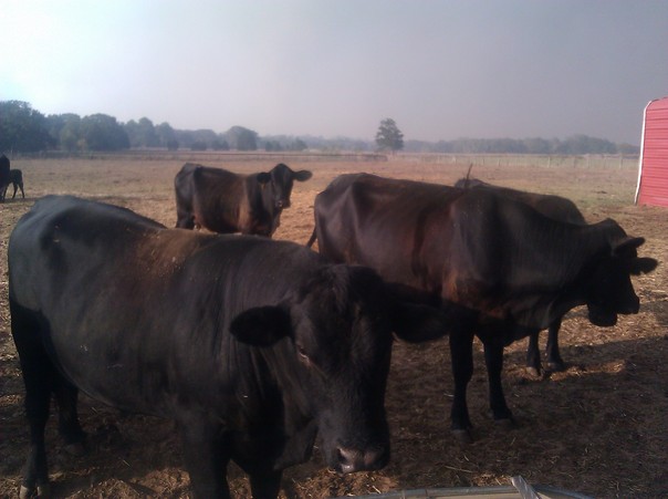 The three black cattle were grazing in a large group on the grass of the hill. |