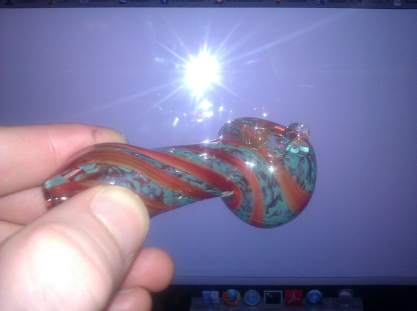 A CLOSE UP OF A RED AND BLUE STRIPED GLASS "TOBACCO" PIPE. |