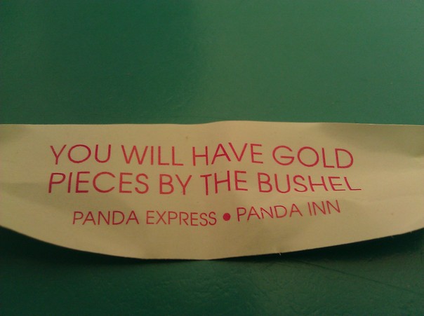 The fortune out of a cookie at Panda Express/Panda Inn touts, "You will have gold pieces by the bushel." |