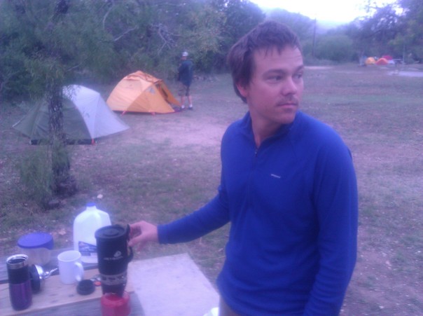 The young man is wearing a blue shirt as he drinks his morning coffee in front of the camping tents. |
