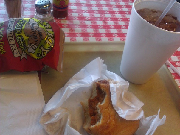 A partially eaten hamburger on a tray next to a bag of BBQ chips and a soft drink. |