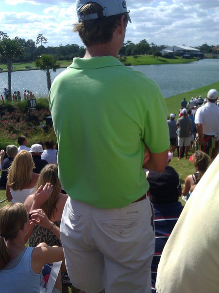 A man in green standing up in the crowd to get a better look. |