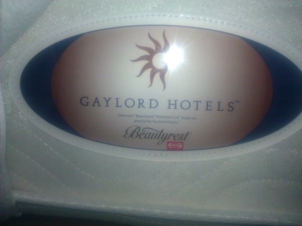 A sewn in Gaylord Hotels logo on a white Beautyrest mattress. |
