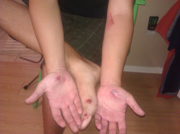 This person has painful looking wounds on their hands, arms and feet. |